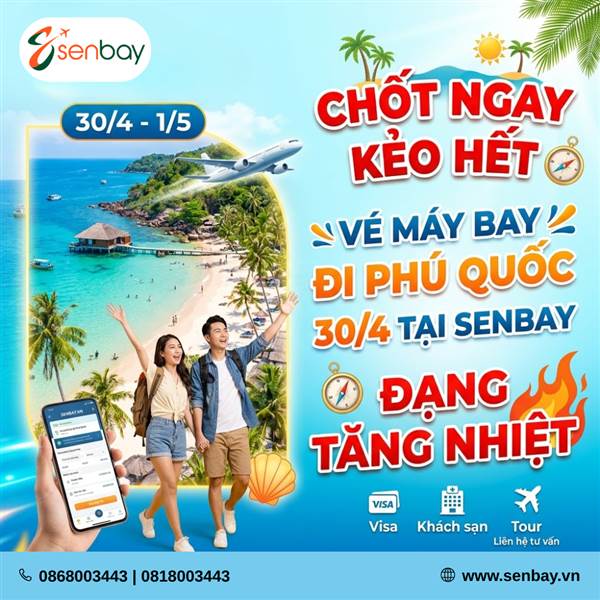 Kỳ nghỉ lễ 30/4 và 1/5 năm nay là cơ hội tuyệt vời để những tín đồ du lịch thực hiện chuyến hành trình đến với "thiên đường hạ giới" Phú Quốc. Với sức hút khó cưỡng từ những bãi cát trắng mịn, làn nước biển trong xanh và hệ thống nghỉ dưỡng đẳng cấp, Đảo Ngọc đang trở thành điểm đến "quốc dân". Tuy nhiên, sức nóng này cũng khiến thị trường vận chuyển trở nên căng thẳng. Hiện nay, hệ thống vé máy bay đi Phú Quốc 30/4 tại Senbay đang ghi nhận lượng giao dịch kỷ lục. Nếu bạn không nhanh tay, cơ hội sở hữu tấm vé giá tốt sẽ trôi qua rất nhanh.